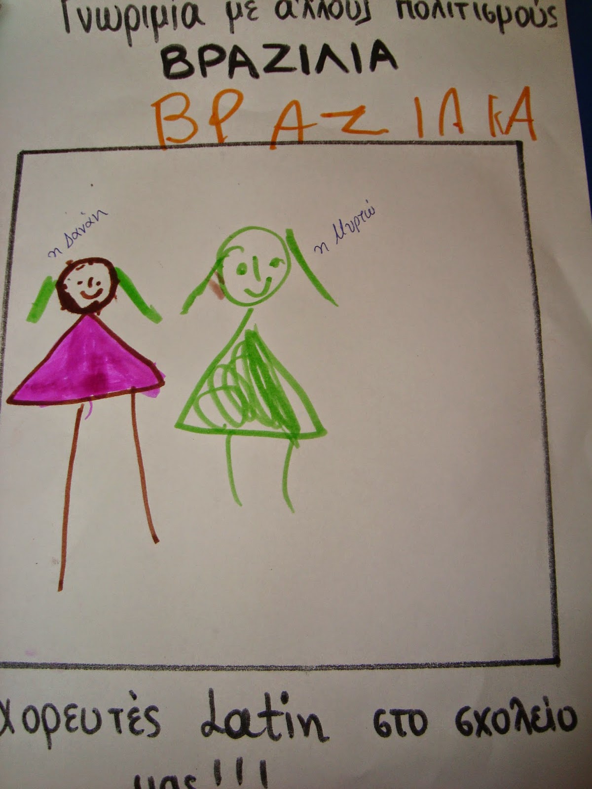 Στην τάξη μέσα, συνεχίσαμε με συζήτηση γύρω από το λατινοαμερικάνικο πολιτισμό. Απορίες και ερωτήσεις μας βρήκαν απαντήσεις, είδαμε τα γράμματα που χρησιμοποιούν εκεί και παρατηρήσαμε ότι μερικά είναι ίδια με τα δικά μας, μιλήσαμε για το καρναβάλι του Ρίο και είδαμε εικόνες από την παρέλαση με άρματα, μάθαμε για τα φαγητά τους, για τις συνήθειές τους κλπ.
